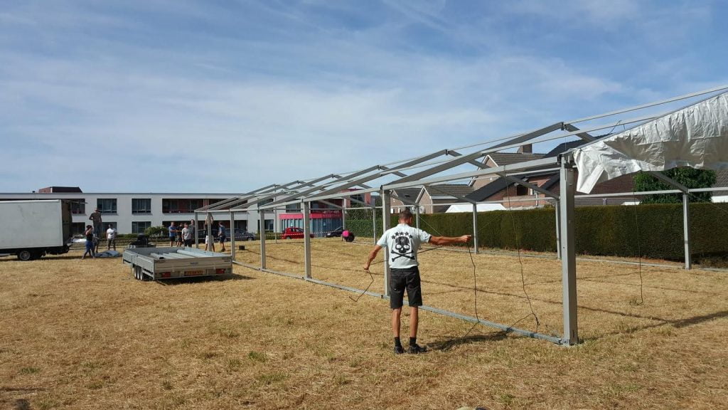Indien de Aluhal tent zonder cassettevloer wordt geplaatst, dan kan dit uitsluitend op een vlakke en rechte ondergrond. De tent wordt niet uitgevuld of verhoogd.