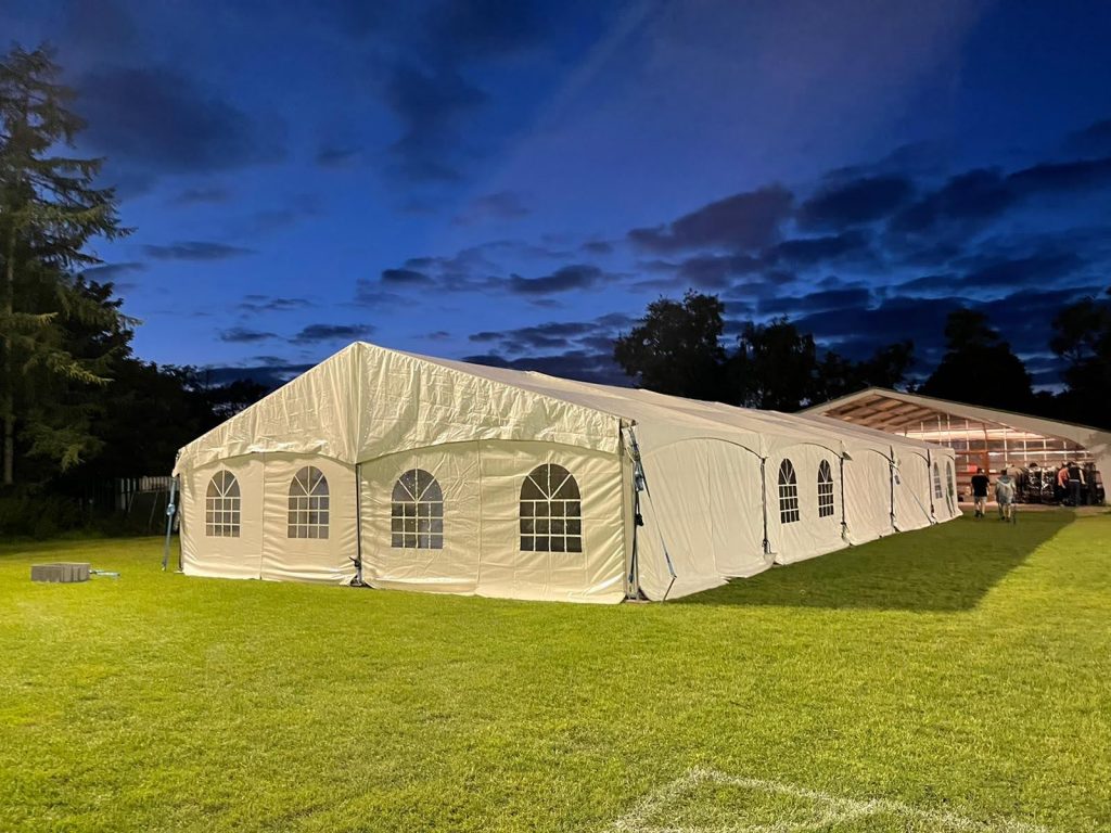 De Aluhal tent 10 x 35 meter is een luxe tent met een aluminium frame en een zelfdragende constructie.