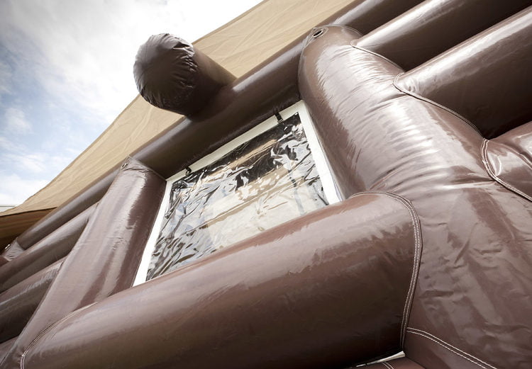 De opblaasbare feesttent heeft vaste zijwanden met ramen die door middel van ritsen open gemaakt kunnen worden.