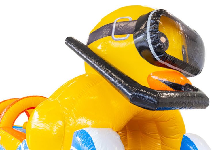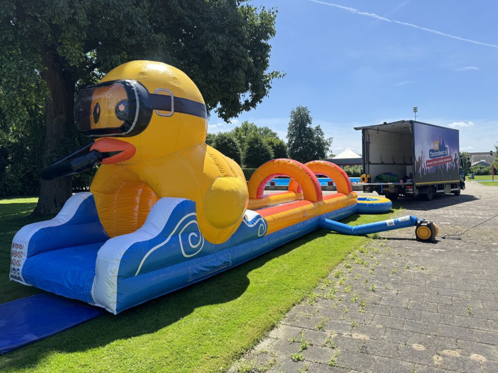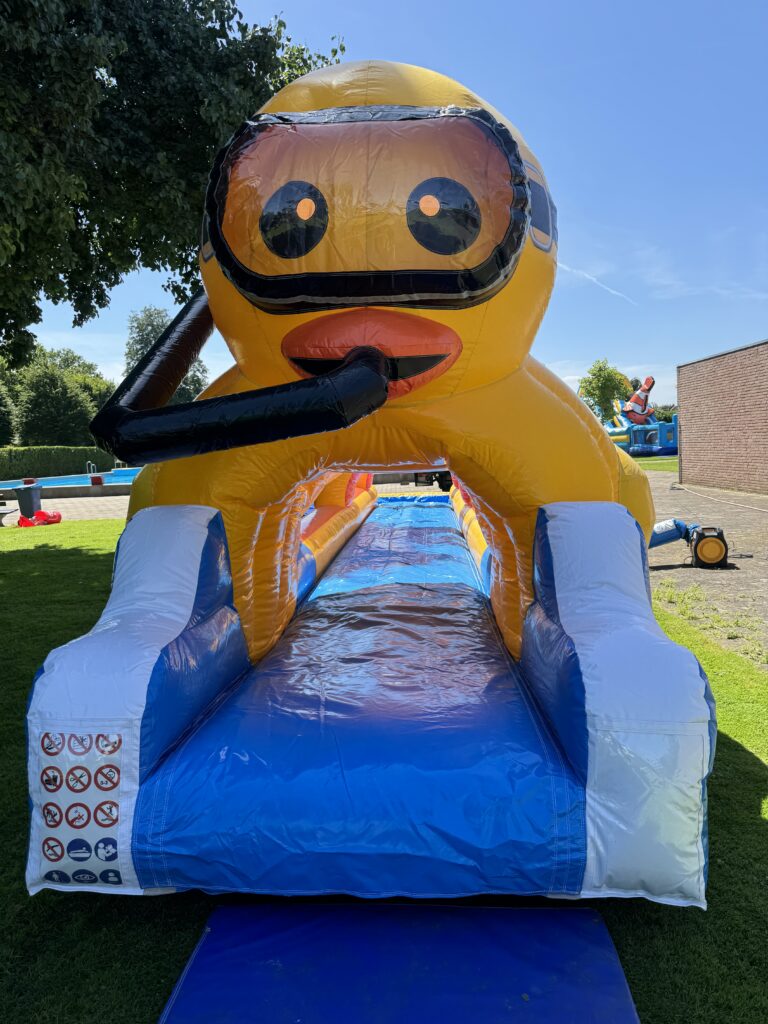 Zoekt u iets bijzonders voor uw feest of gelegenheid? Nou dan is deze XXL buikschuifbaan Ducky het antwoord! Met maar liefst een afmeting van 12.0 x 3.5 M en een hoogte van 5 meter is dit een ware eye catcher. Het spektakel voor jong en oud !