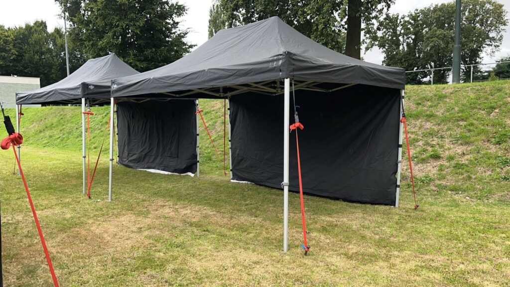 Hierdoor is het voor ons ook heel belangrijk dat onze tenten op de juiste manier zijn verankerd. Dit kan doormiddel van haringen of onze ballastblokken van maar liefst 150KG per stuk.