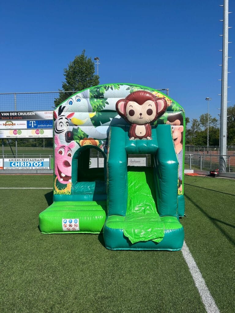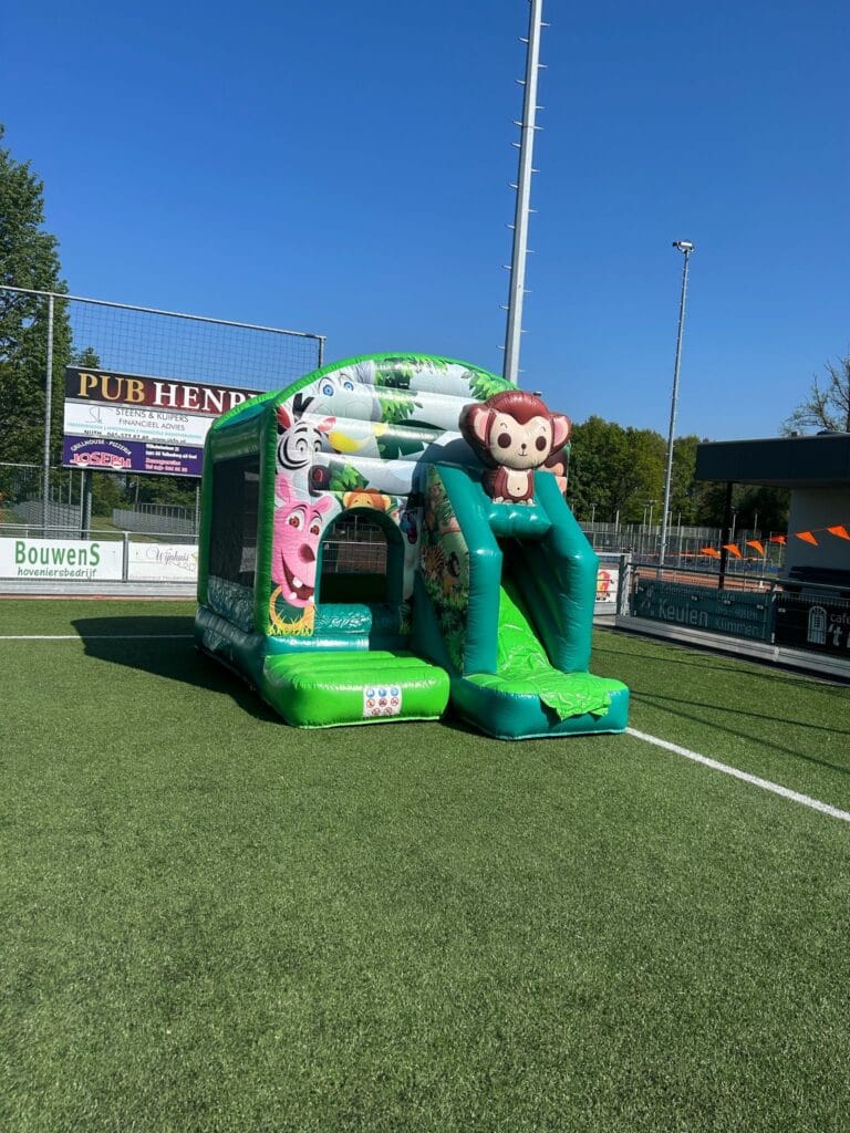 Laat dit Jungle springkussen uw feestje opleuken! Dit kleurrijke springkussen trekt meteen de aandacht. Van de buitenkant is het nog een verrassing wat er binnen allemaal te beleven valt. Voorzien van regen / zonnen dak en een glijbaan