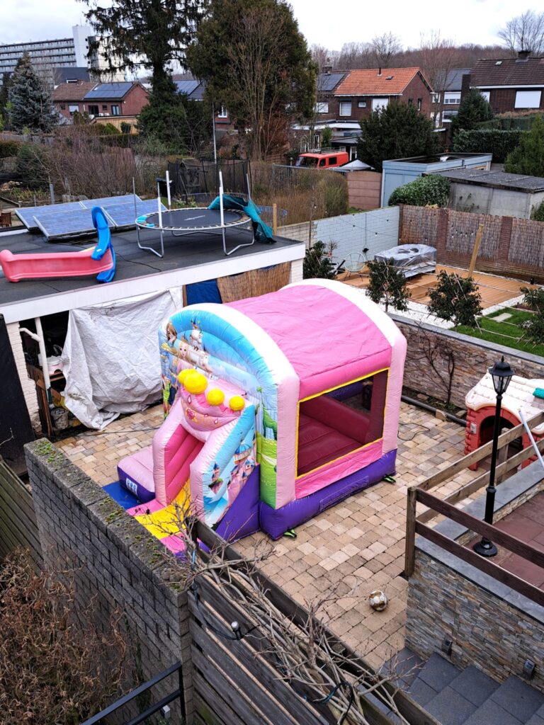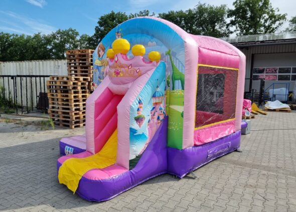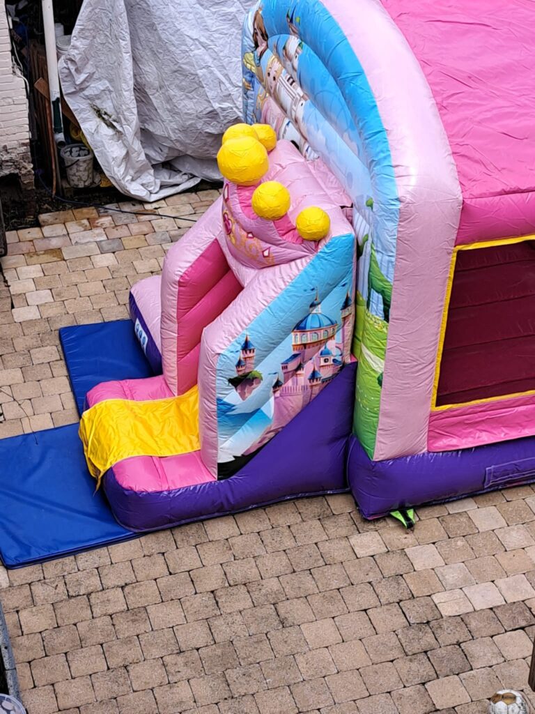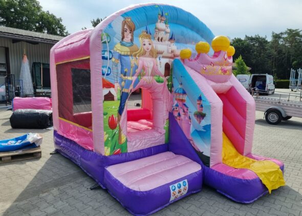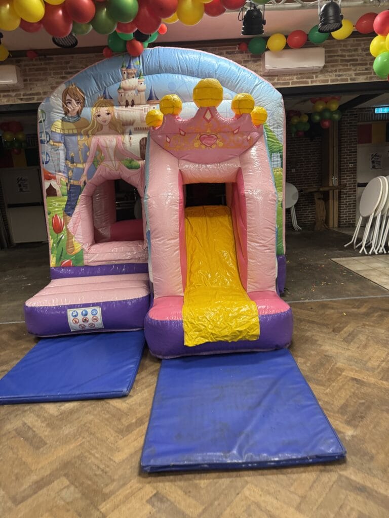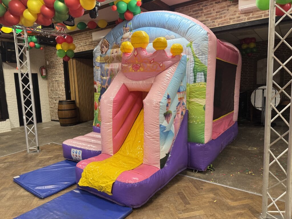Dit leuke springkussen is een echte topper onder meisjes. Want welk meisje wil nu niet een princes zijn? Met dit leuke kleine springkussen in prinsessen thema voelen ze zich net een echt prinsesje. Dit kleine springkussen heeft een echte glijbaan en een dak. Daarom staat het garant voor uren speelplezier. Ook als het weer ietsje minder is! Voorzien van regen / zonnen dak en een glijbaan