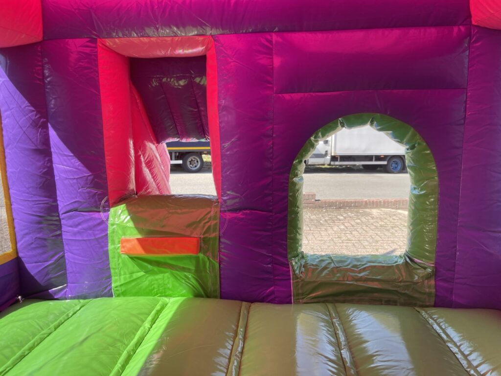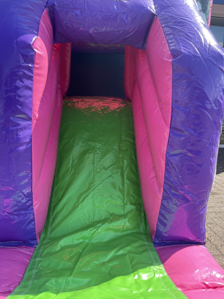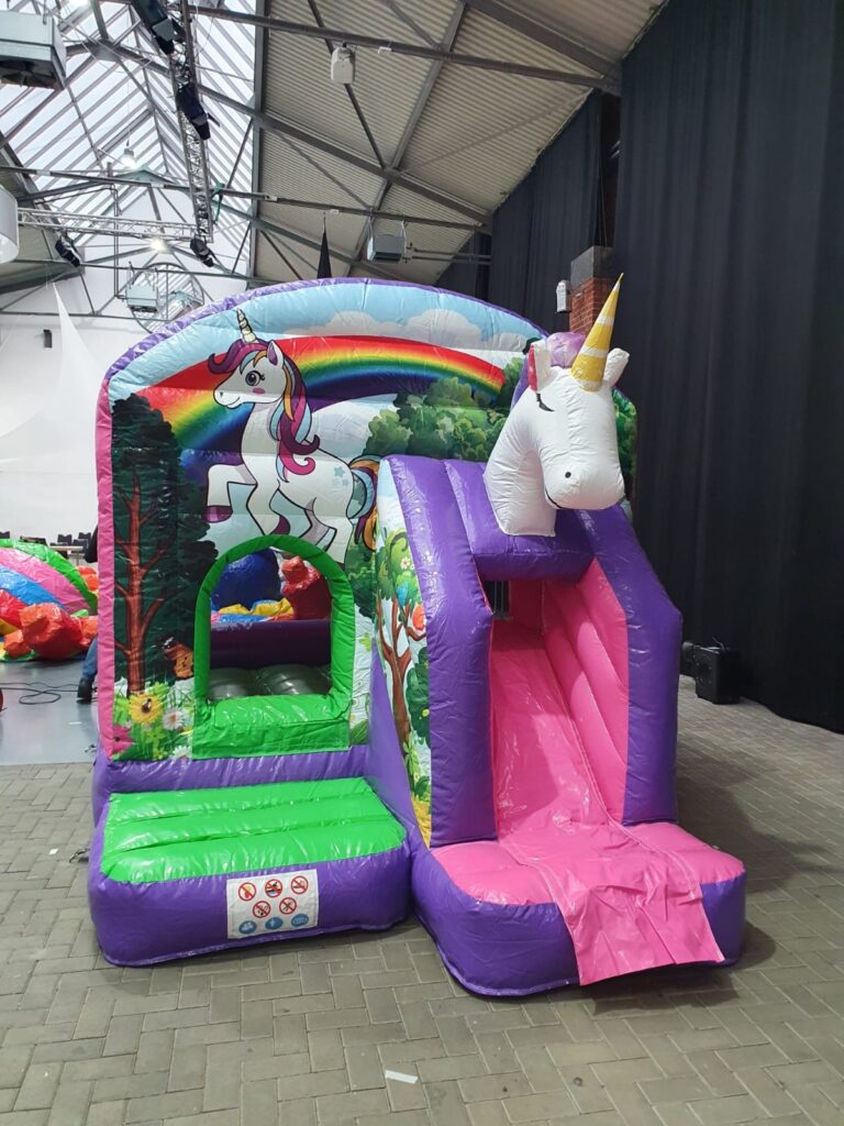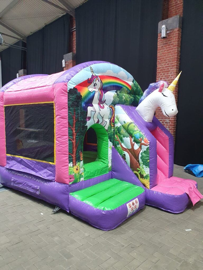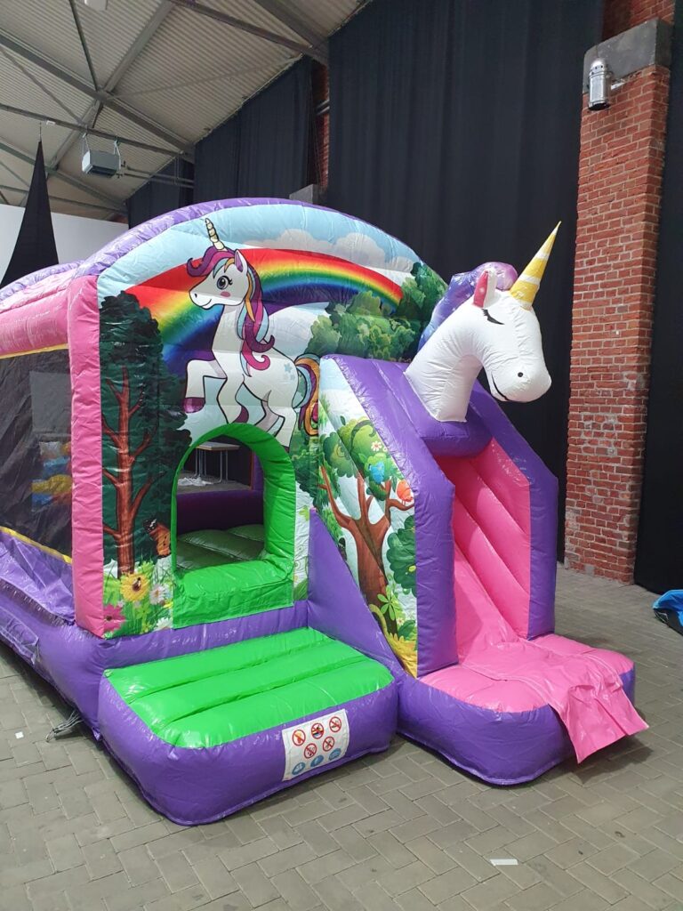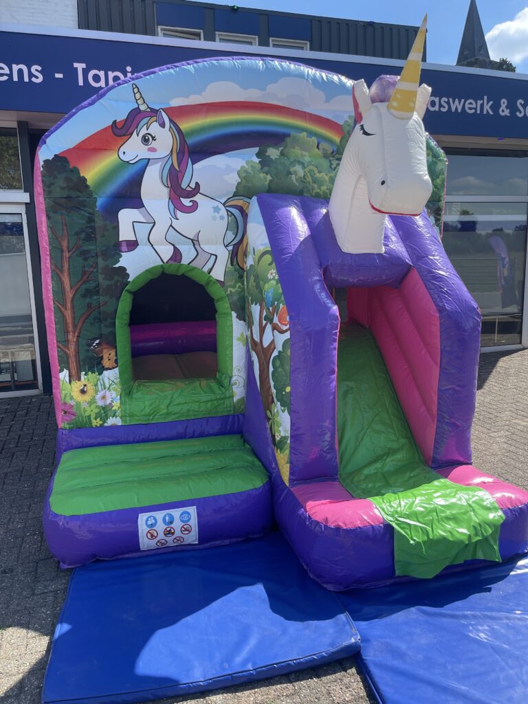 Laat dit Unicorn springkussen uw feestje opleuken! Dit kleurrijke springkussen trekt meteen de aandacht. Van de buitenkant is het nog een verrassing wat er binnen allemaal te beleven valt. Voorzien van regen / zonnen dak en een glijbaan.